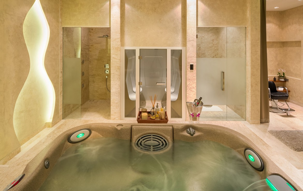 The complex offers a variety of amenities, including a wellness center with a hot tub.