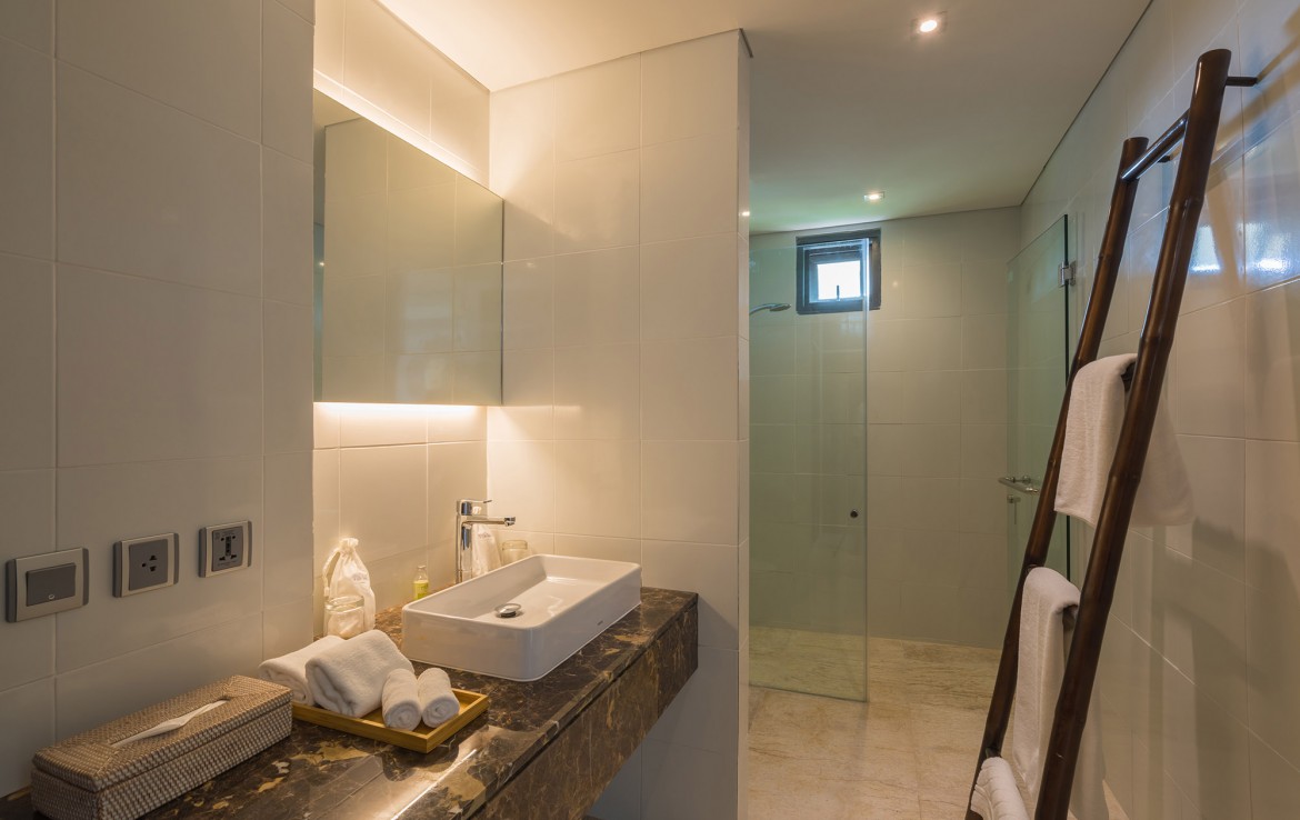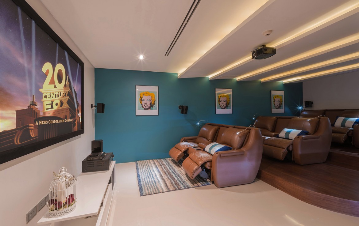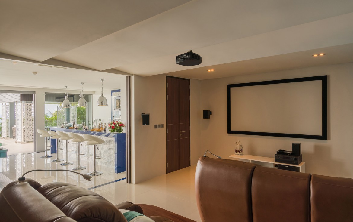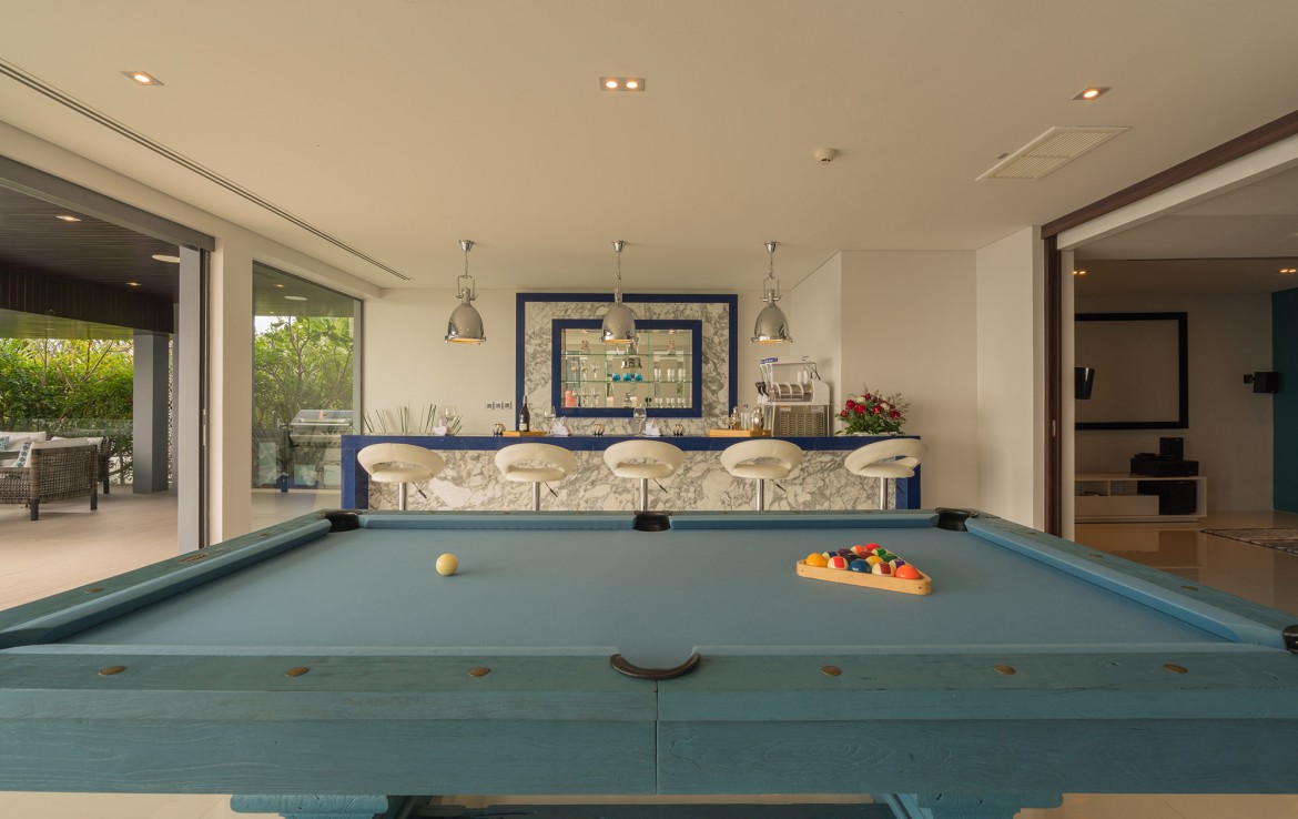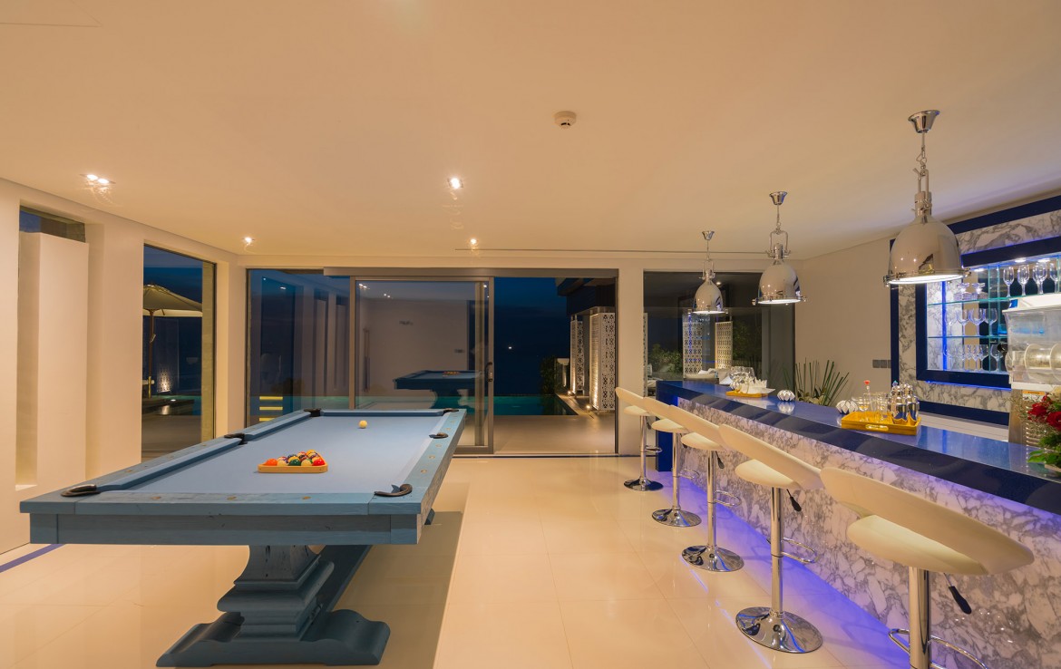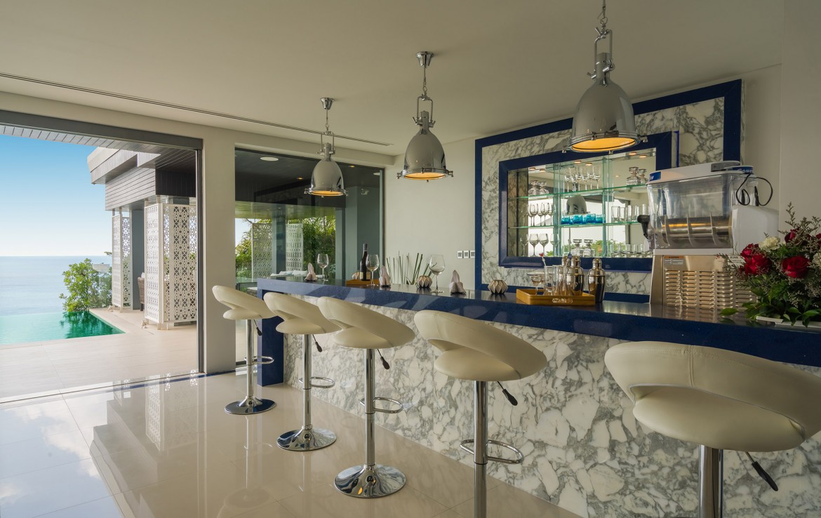 Вилла, продуманная до мелочей, отражает любовь владельца к морю и тропической жизни, с произведениями искусства, декором и мебелью в элегантных белых, зеленых и синих тонах. Заметным исключением из этой яркой морской темы, является обеденная зона с шикарным баром и гостевой кухней, роскошными красными замшевыми стульями и 12-местным столом из цельного дерева, азиатскими артефактами и черной люстрой, вызывающими ощущение экзотики.