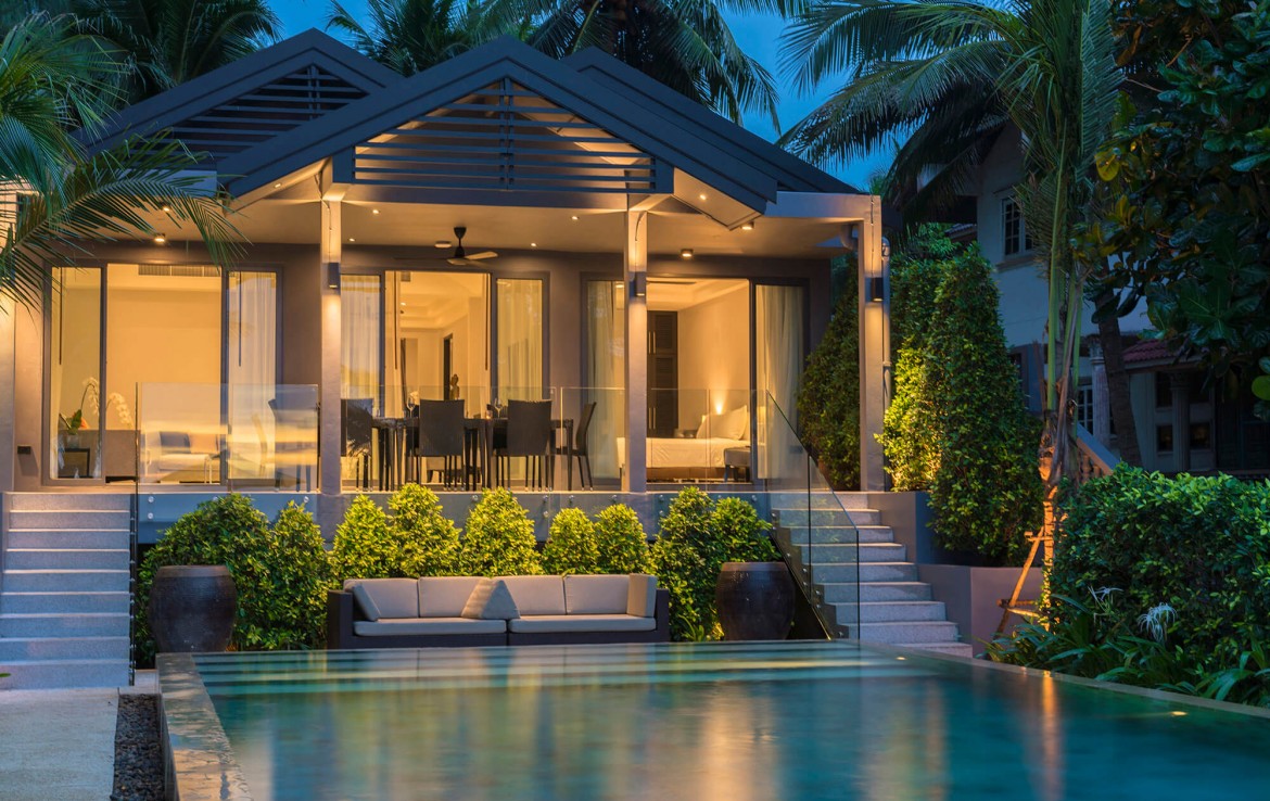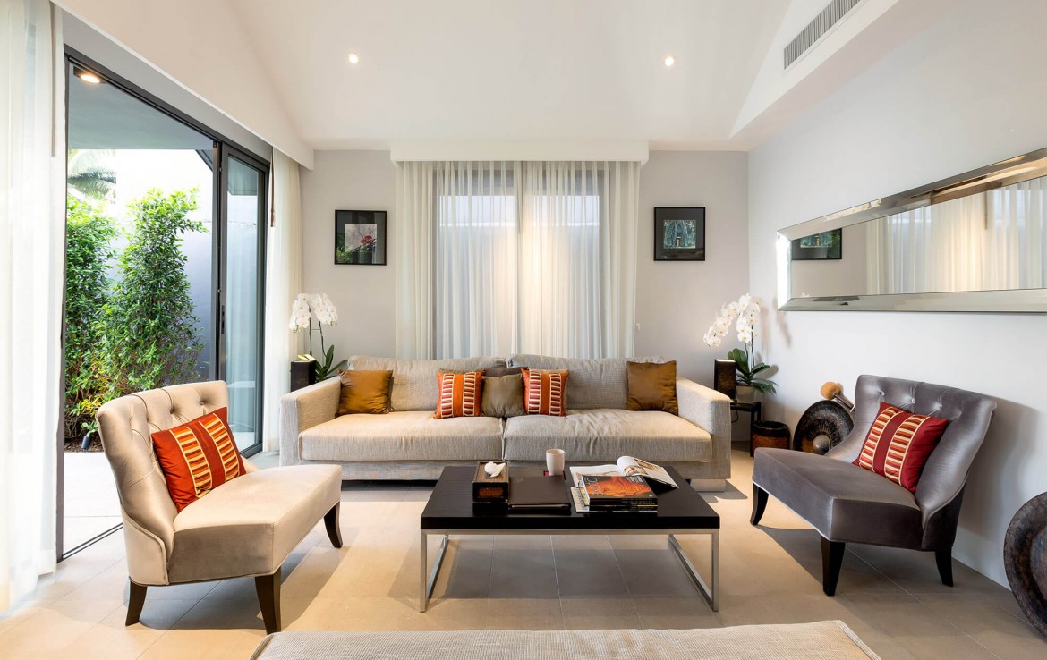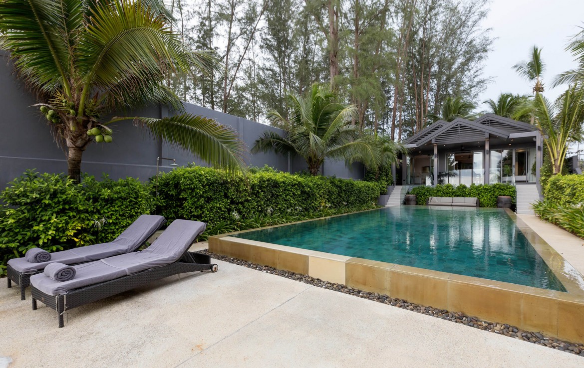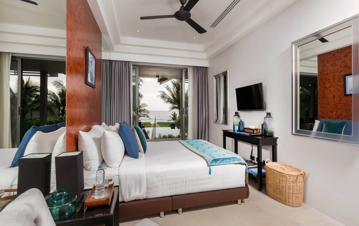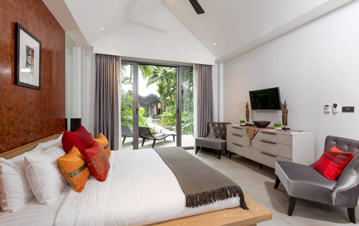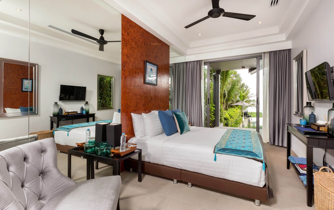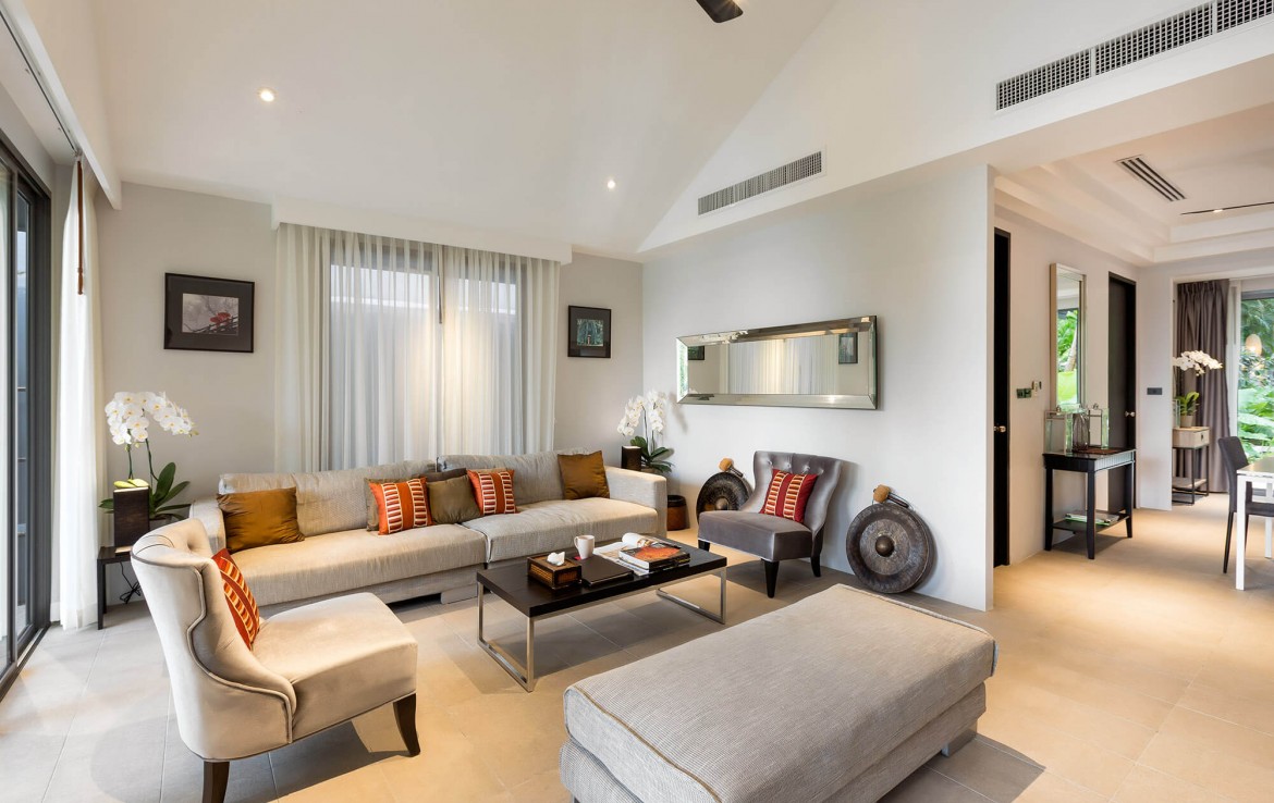 Свежий и яркий дизайнe создает успокаивающее настроение с четкой серой и белой мебелью из мягких тканей и акцентами в буддийском стиле. Одноэтажные павильоны виллы и пышные пальмовые сады создают ненавязчивую роскошь, окруженную 15-метровым бассейном и бесконечным синим морем и небом, которые придают вилле свой шарм.