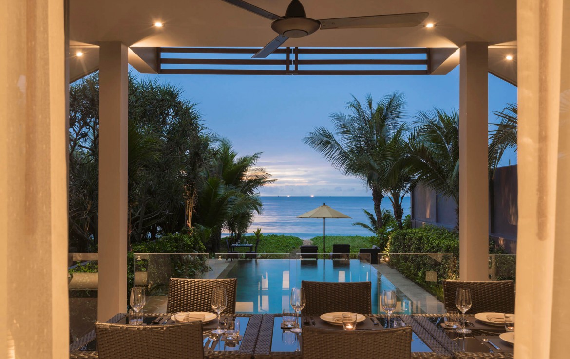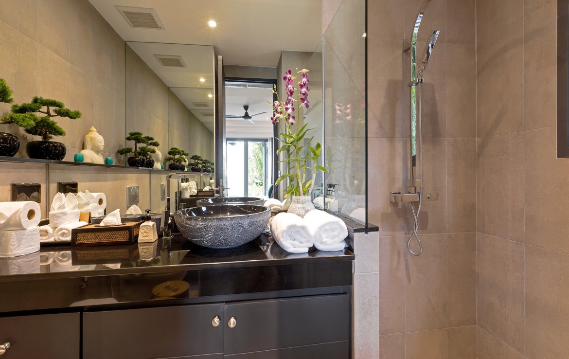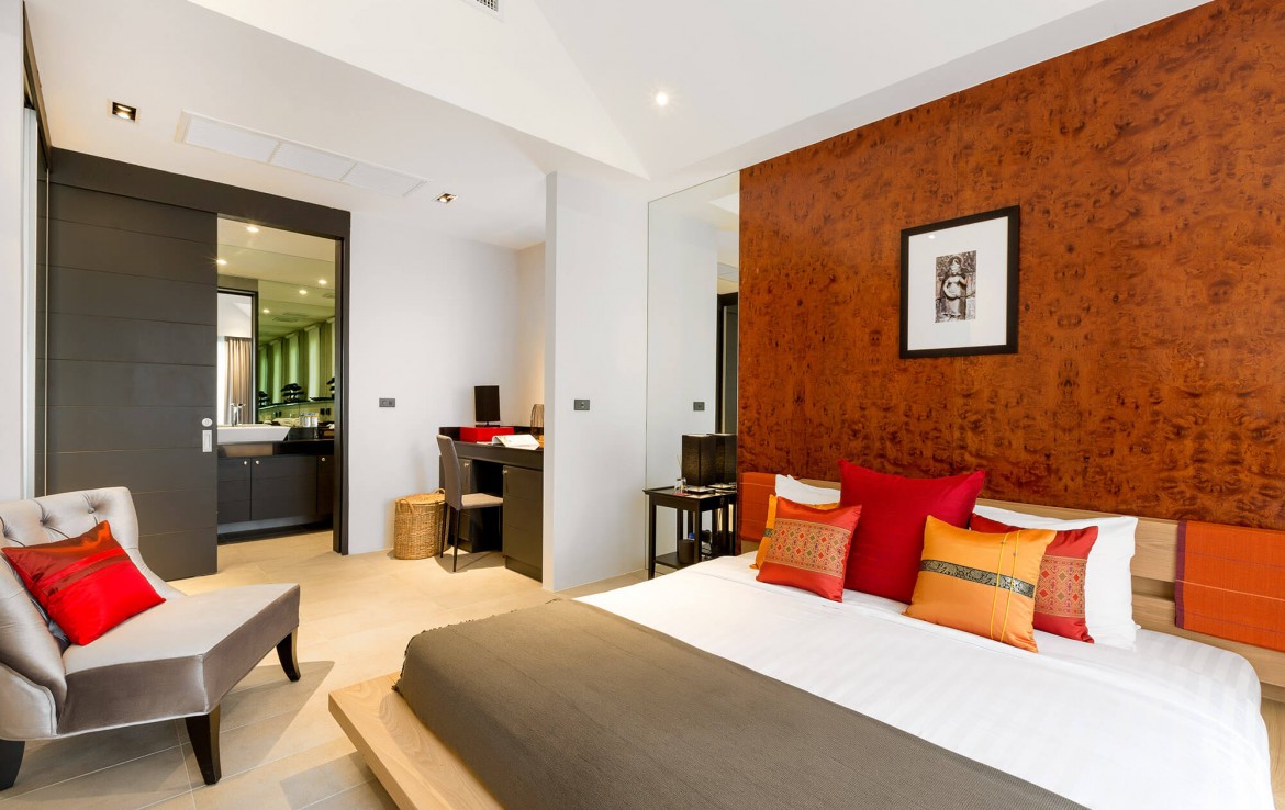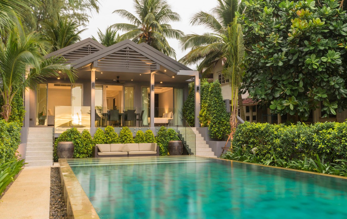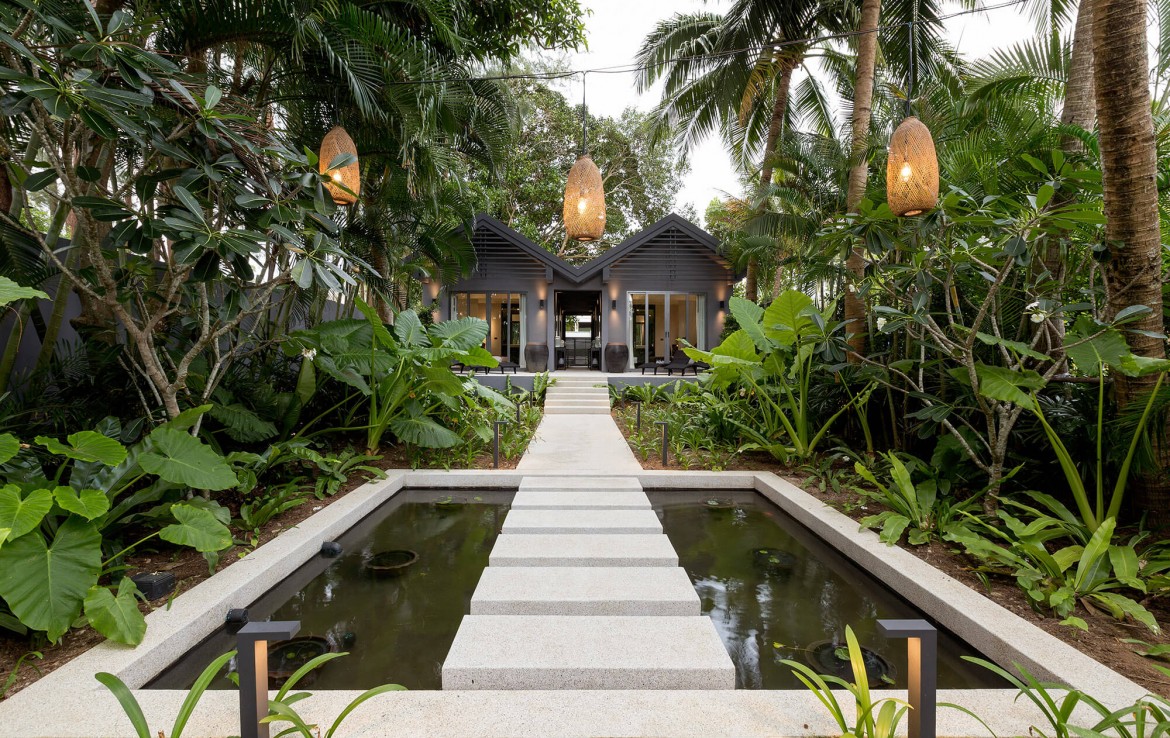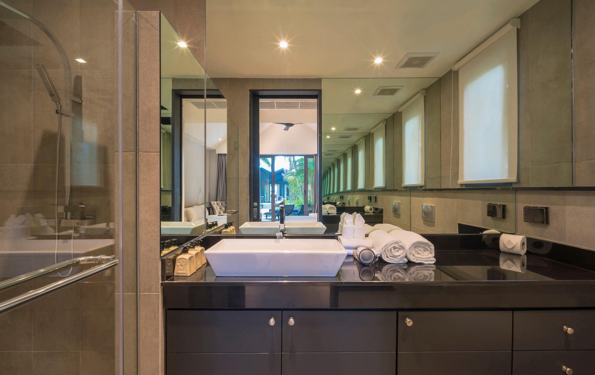 Свежий и яркий дизайнe создает успокаивающее настроение с четкой серой и белой мебелью из мягких тканей и акцентами в буддийском стиле. Одноэтажные павильоны виллы и пышные пальмовые сады создают ненавязчивую роскошь, окруженную 15-метровым бассейном и бесконечным синим морем и небом, которые придают вилле свой шарм.