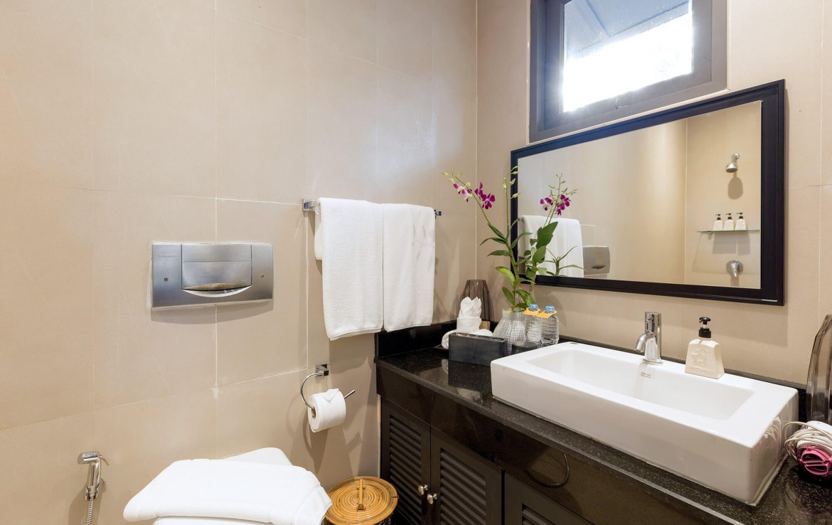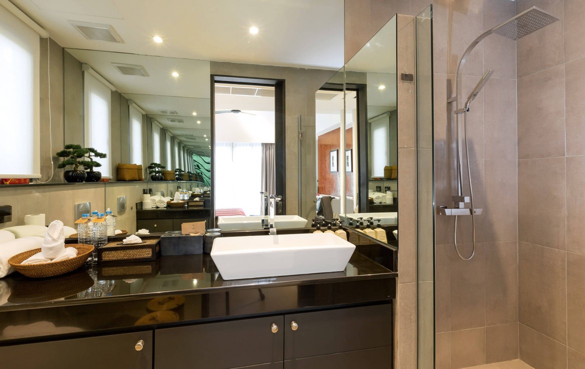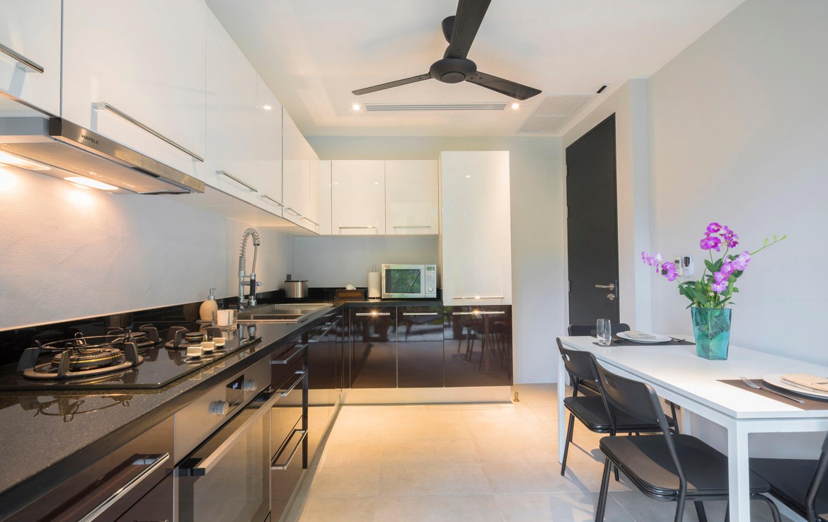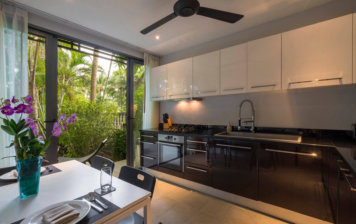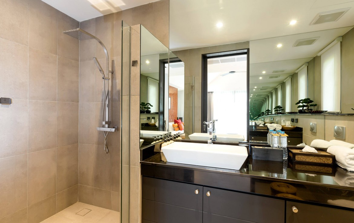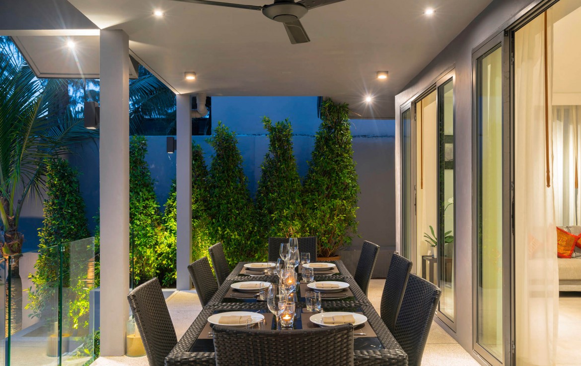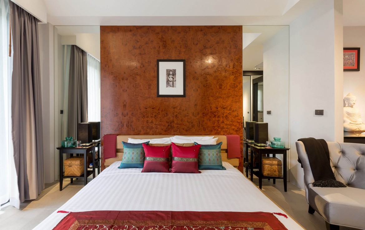 Свежий и яркий дизайнe создает успокаивающее настроение с четкой серой и белой мебелью из мягких тканей и акцентами в буддийском стиле. Одноэтажные павильоны виллы и пышные пальмовые сады создают ненавязчивую роскошь, окруженную 15-метровым бассейном и бесконечным синим морем и небом, которые придают вилле свой шарм.