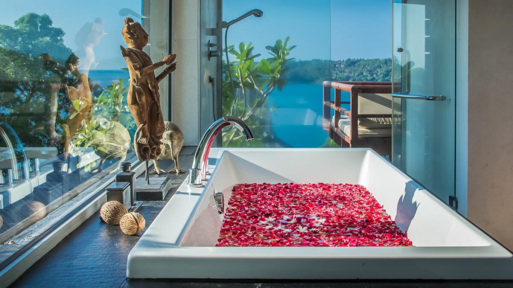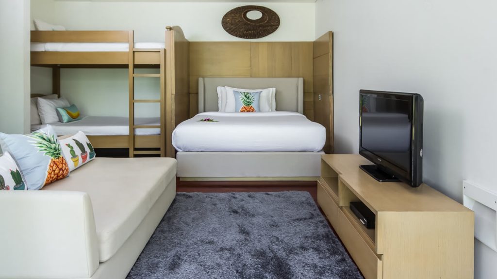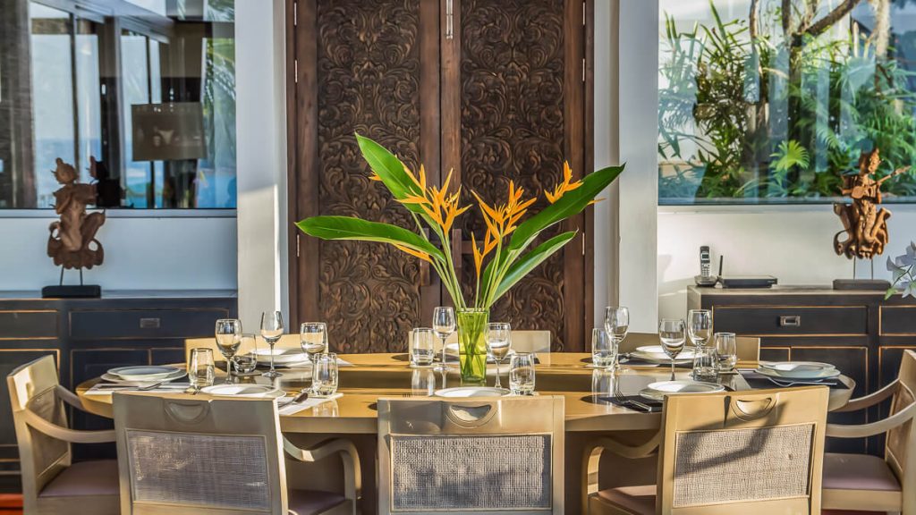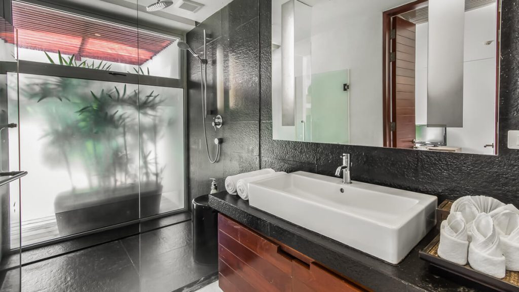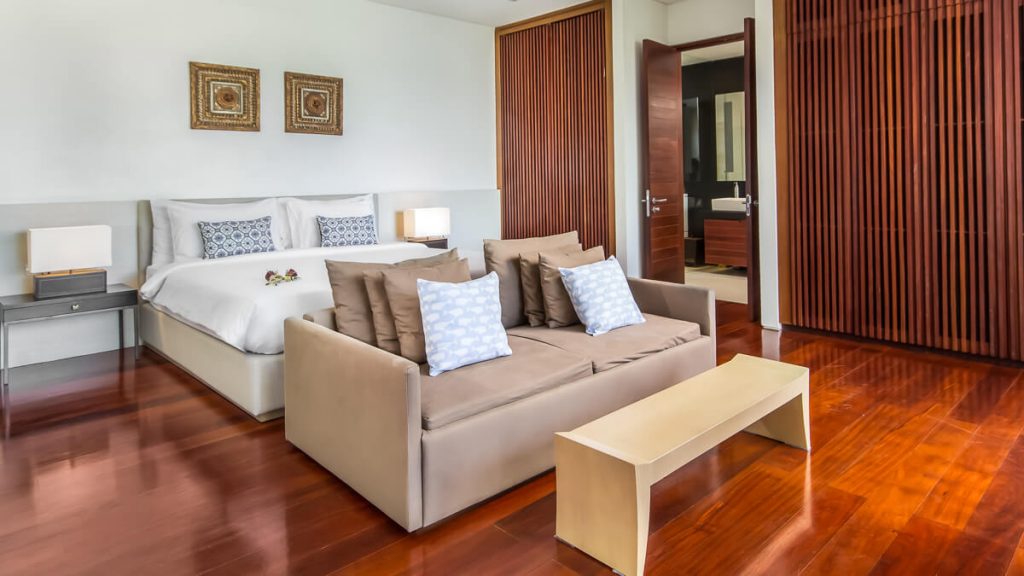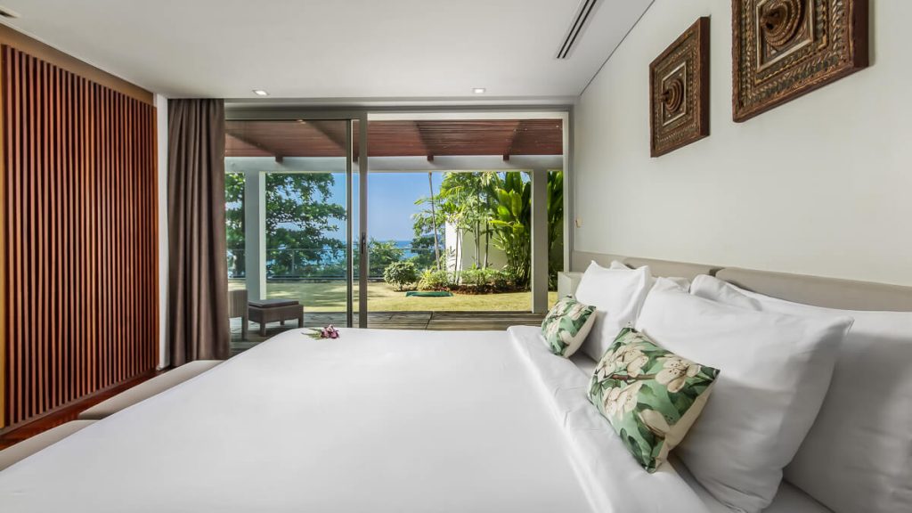 Вилла имеет четыре элегантные спальни, каждая со своими собственными ванными комнатами. На верхнем уровне находится просторная главная спальня с роскошной ванной комнатой, офисной зоной и небольшой гостиной, выходящей на отдельный балкон с шезлонгами на открытом воздухе и панорамным видом на океан.