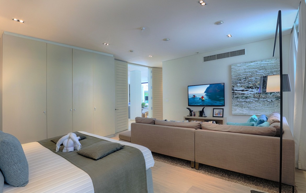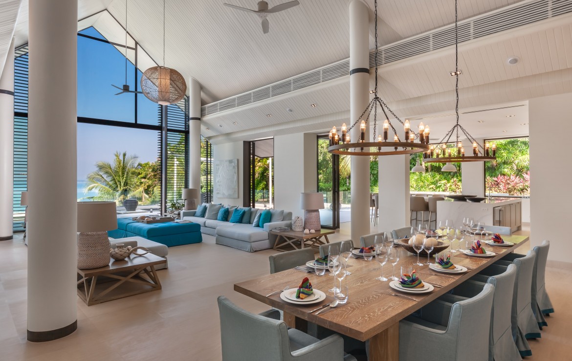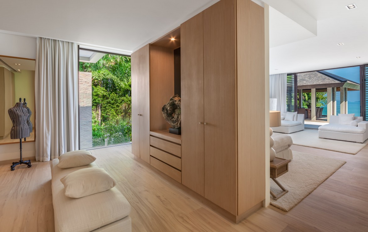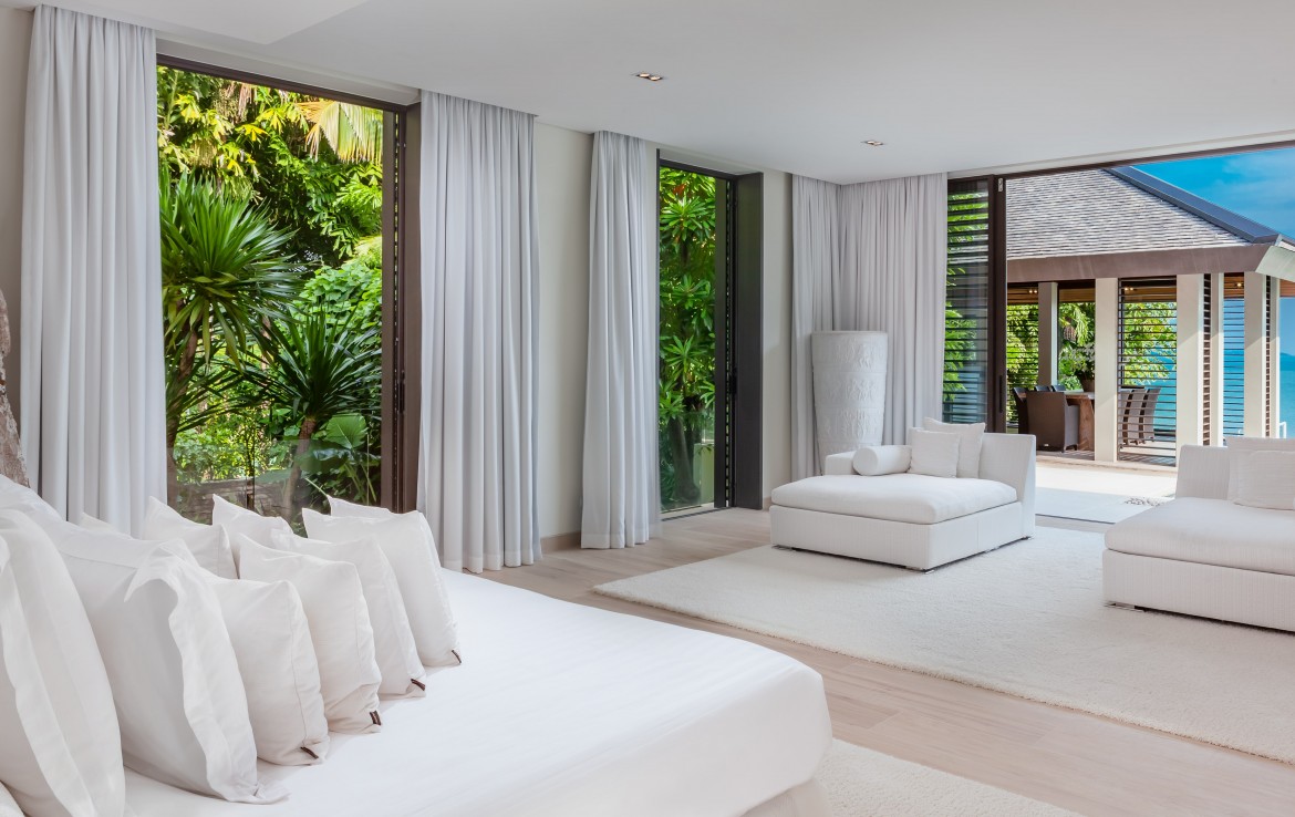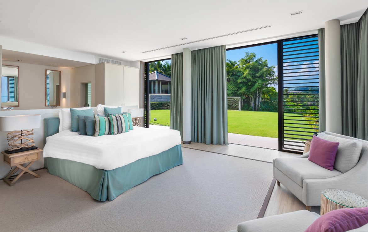 Всего на вилле 5 спален, каждая из которых имеет собственную ванную комнату. Одна из комнат построена в виде отдельного бунгало всего в нескольких метрах от главного дома и предлагает еще более близкий вид на залив. Практически по всей ширине усадьбы простирается переливной бассейн длиной 25 м, а сад простирается до пляжной полосы усадьбы. На вилле также есть обеденная зона и салат на открытом воздухе, бар у бассейна, джакузи, футбольная сетка, байдарки и комната для развлечений с бильярдным столом, Xbox, настольные игры и Apple TV.