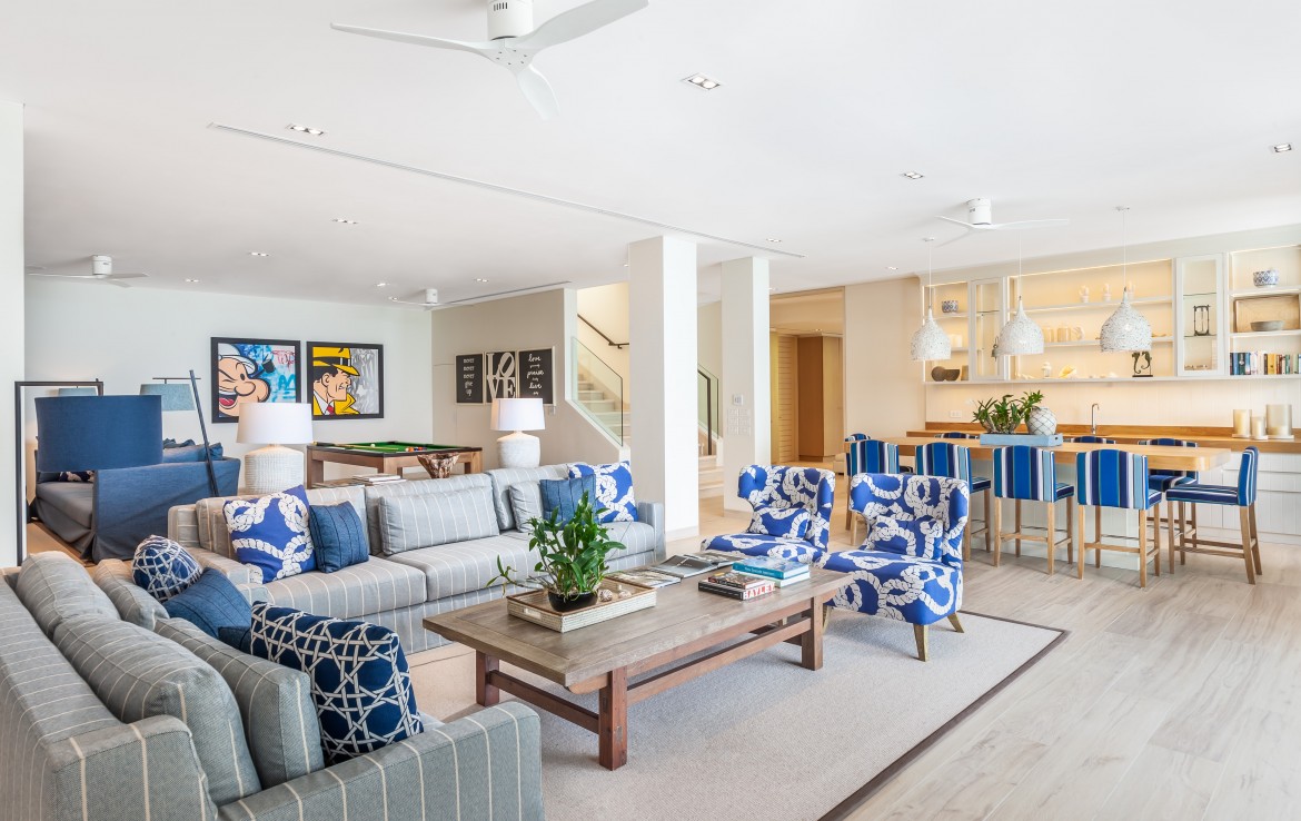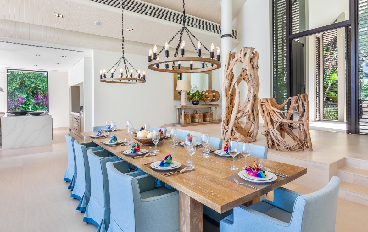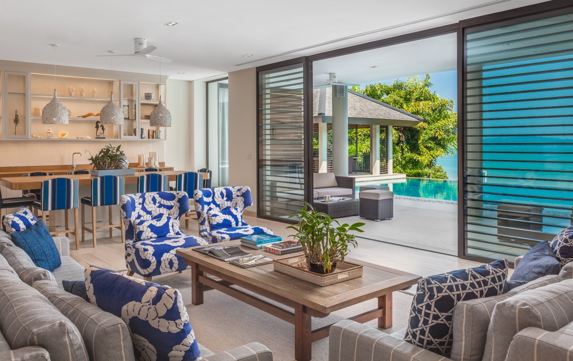 От входа на территорию виллы по каменным ступеням, прорезающим пышный тропический сад, Вы попадаете к главным дверям виллы. Войдя в здание, вы сразу же будете встречены видом на залив Пханг Нга, идеально обрамленным пятиугольным профилем зала. Вы найдете прекрасный обеденный стол и гостиную, щедро обставленную мягкими, удобными диванами. Чистый, минималистичный дизайн и легкие, беззаботные цвета зала создают теплую, манящую атмосферу, которая мгновенно окутывает вас. Впечатляющий сводчатый потолок придает интерьеру дополнительное вертикальное пространство, а свисающие с него люстры придают комнате стильный штрих.